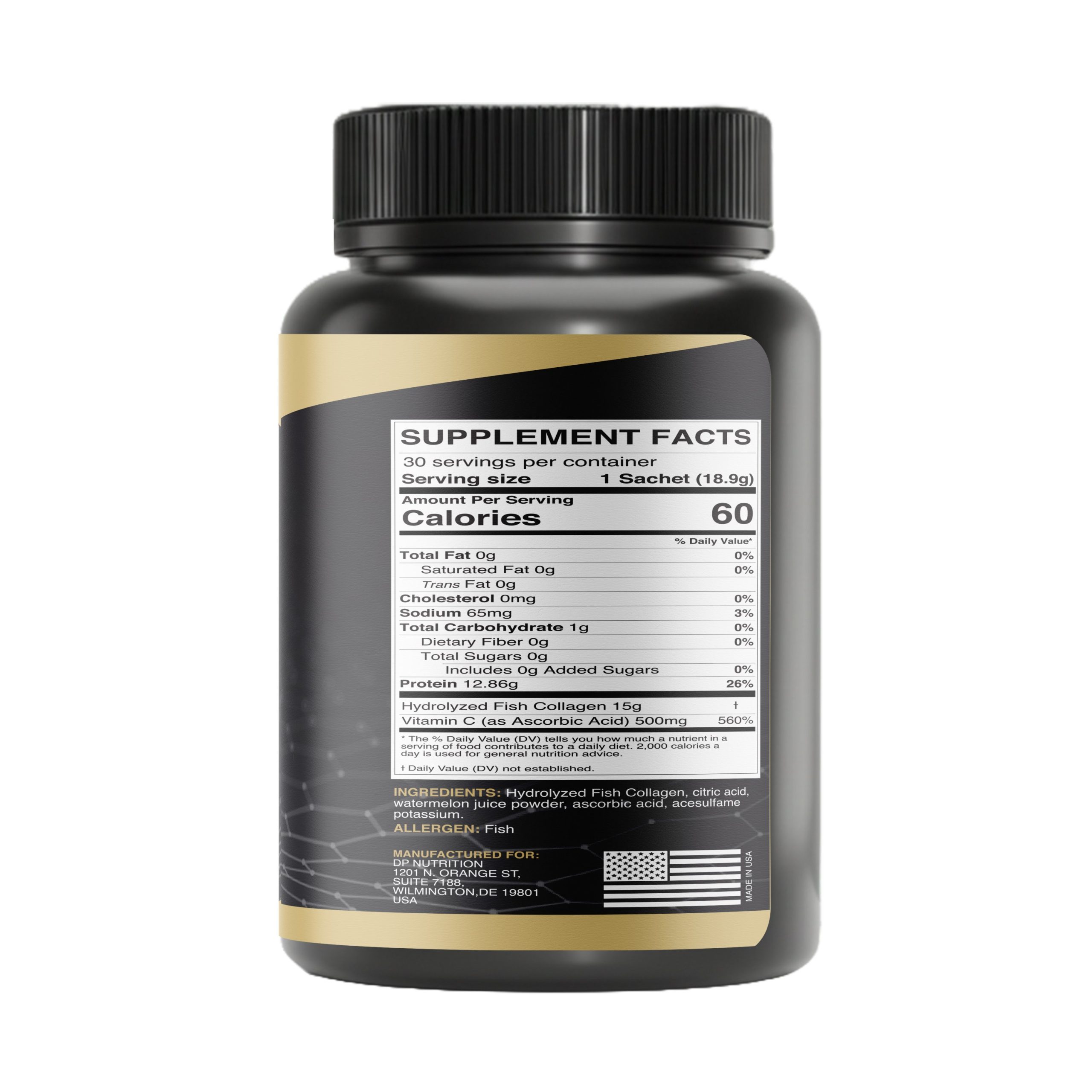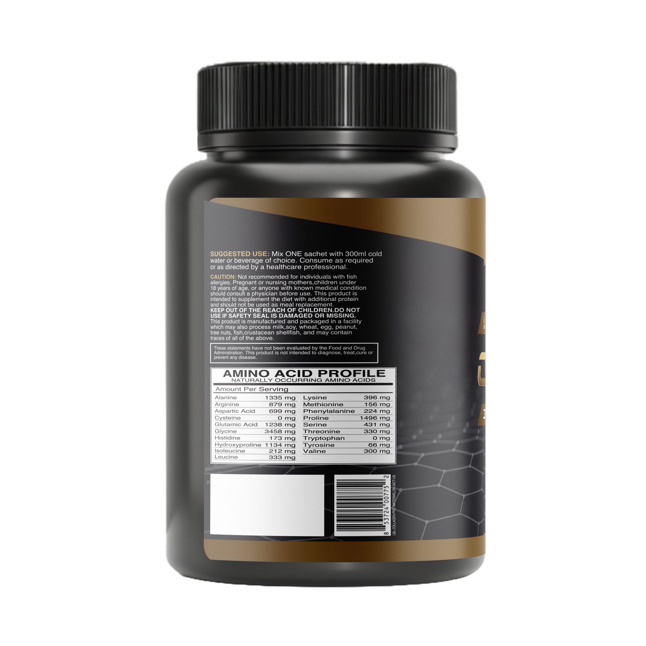 100% Hydrolyzed Fish Collagen. Rich in Amino Acids. 15 grams of Fish Collagen Grade A with 500mg Vitamin C
